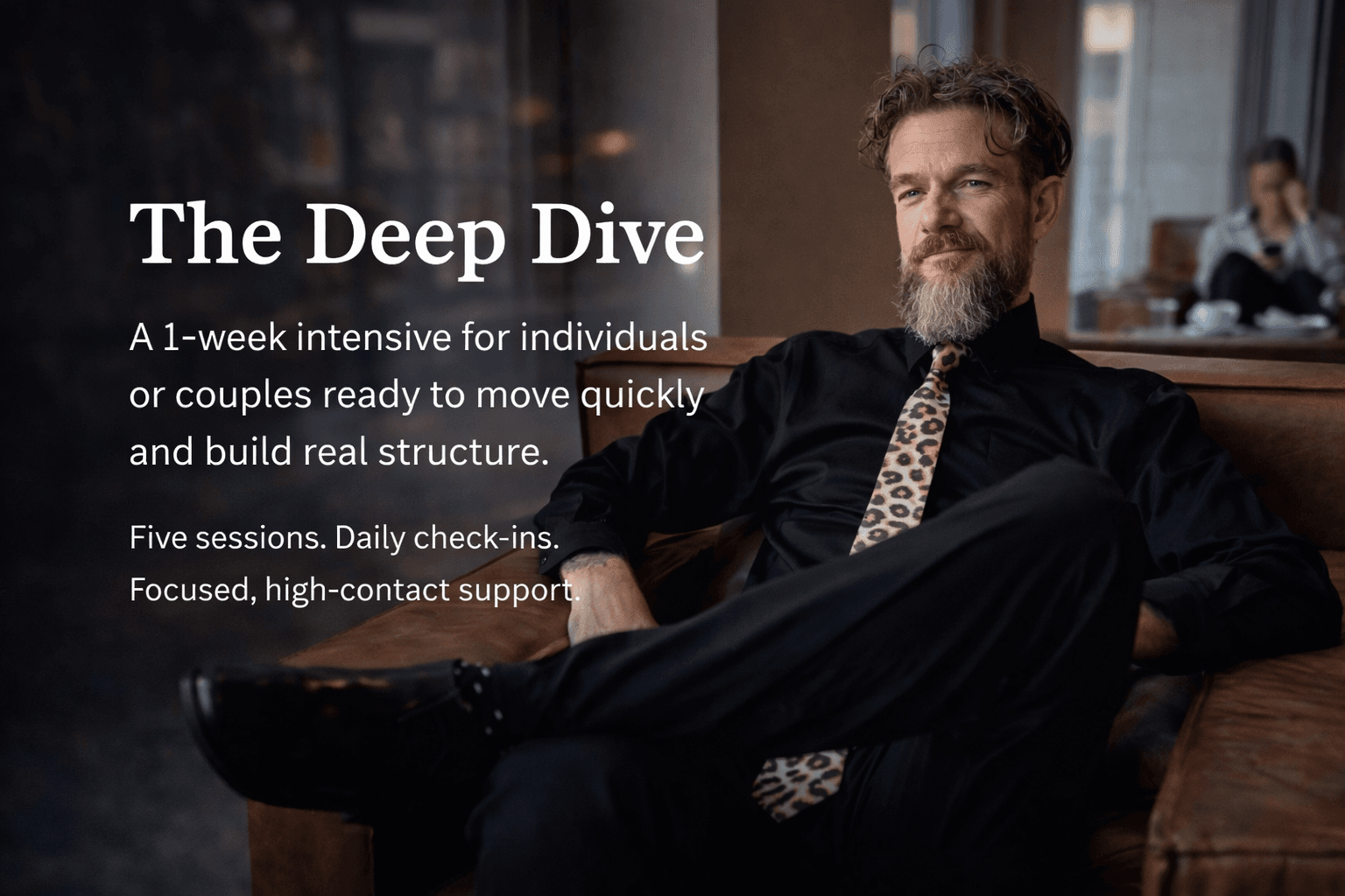 What remains, and what is expanding, is the coaching container, structured, intentional, long-form work rooted in power exchange, leadership, accountability, and the lived reality of relationships.